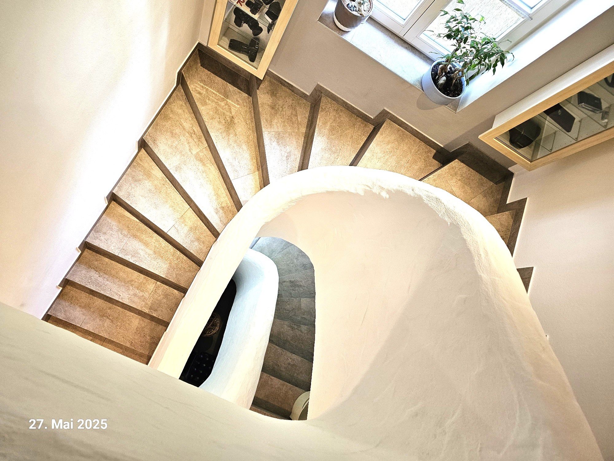 Böden mit wertigen Feinsteinzeugfliesen in den Fluren, und auf der gewendelten Treppe.